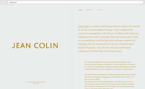 Branding, print collateral and website design for fashion business advisor Jean Colin. The logo hints at the nuances in Jean's approach and refinement with her clients, as the chartreuse tone adds an unexpected playfulness.