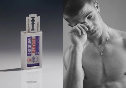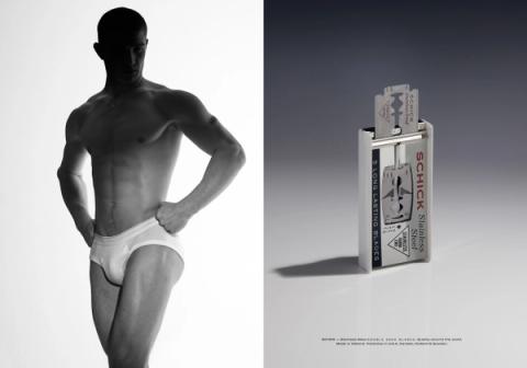 A collection of old razor blade packaging inspired the narrative and typography of this editorial, a modern play on vintage shaving ads. In collaboration with photographer Richie Talboy for Behind the Blinds magazine.